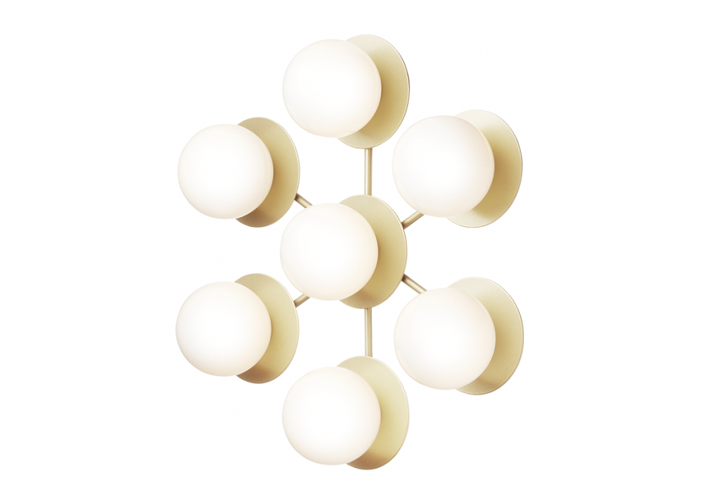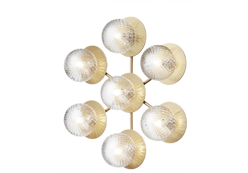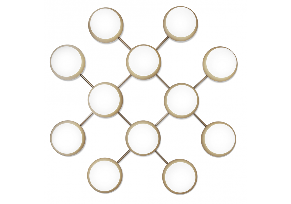 Liila designed by Sofie Refer for Nuura is a modular wall/ceiling lamp with metal structure and diffusers in mouth-blown opaline or transparent glass with relief motifs.