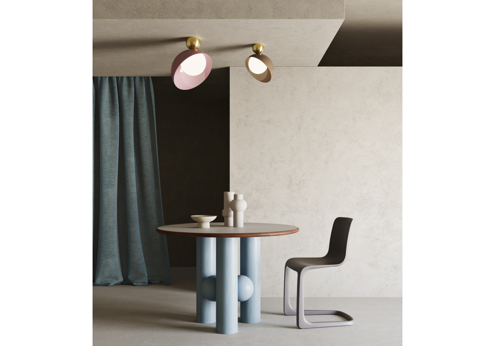 Aurora designed by Virginia Cei for Italamp is a LED ceiling lamp made of painted metal and central sphere in brushed light gold finish. The diffuser is made of white glass.