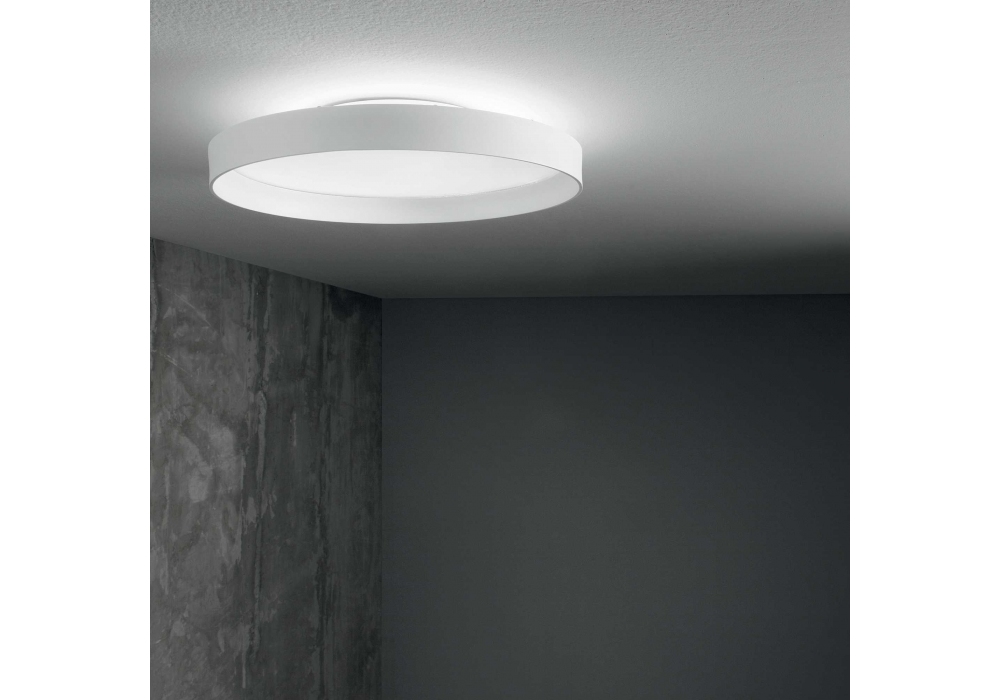 Fly designed and produced by Ideal Lux is a circular ceiling lamp with a powder-coated aluminum structure. The diffuser is made of opal plastic material and shields an LED-type light source integrated in different shades of light. Fly is available in different models and dimmable versions.