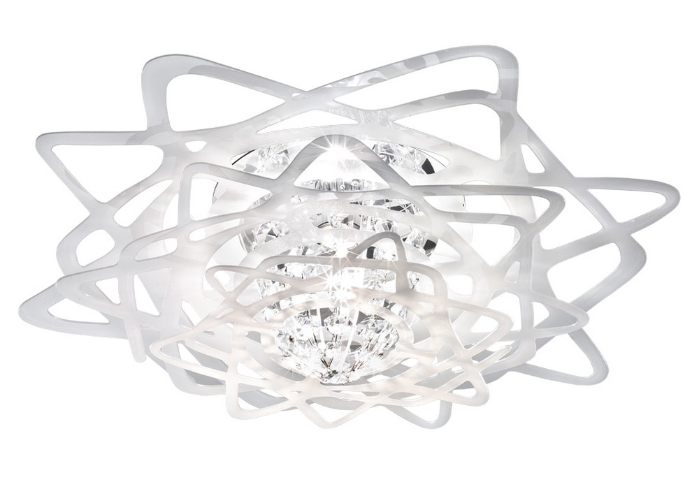 Aurora designed by Nigel Coates for Slamp is a ceiling lamp entirely in Plainflex®/97 Crystals. The diffuser is made of multiple elements of Plainflex®/97 Crystals which shield a dimmable filament LED light source. Aurora is available in different finishes.