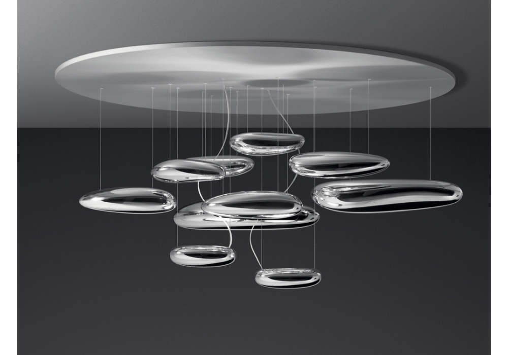 Mercury designed by Ross Lovegrove for Artemide is a ceiling lamp with circular aluminum anchoring plate. The diffusers are floating pebbles with LED light sources with Push dimmability system. Mercury is available in different light source versions.