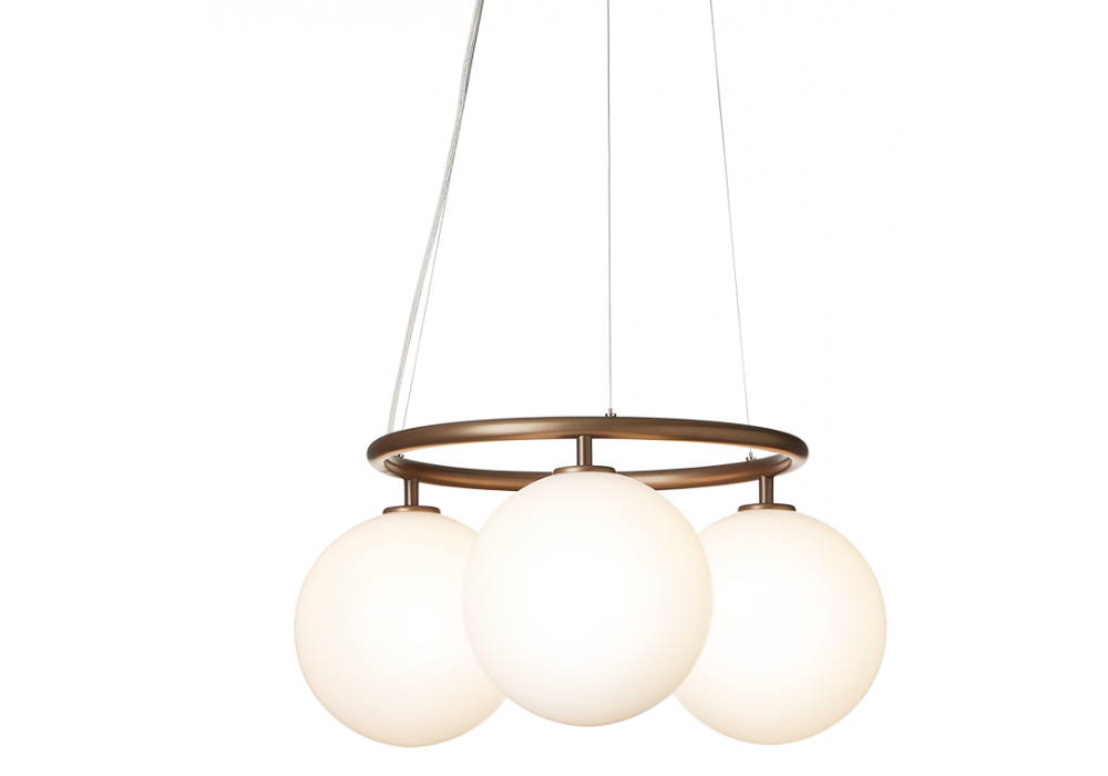 Miira Circular designed by Sofie Refer for Nuura is a chandelier characterized by a powder-coated metal ring and spherical diffusers in mouth-blown opaline or transparent glass with relief motifs.