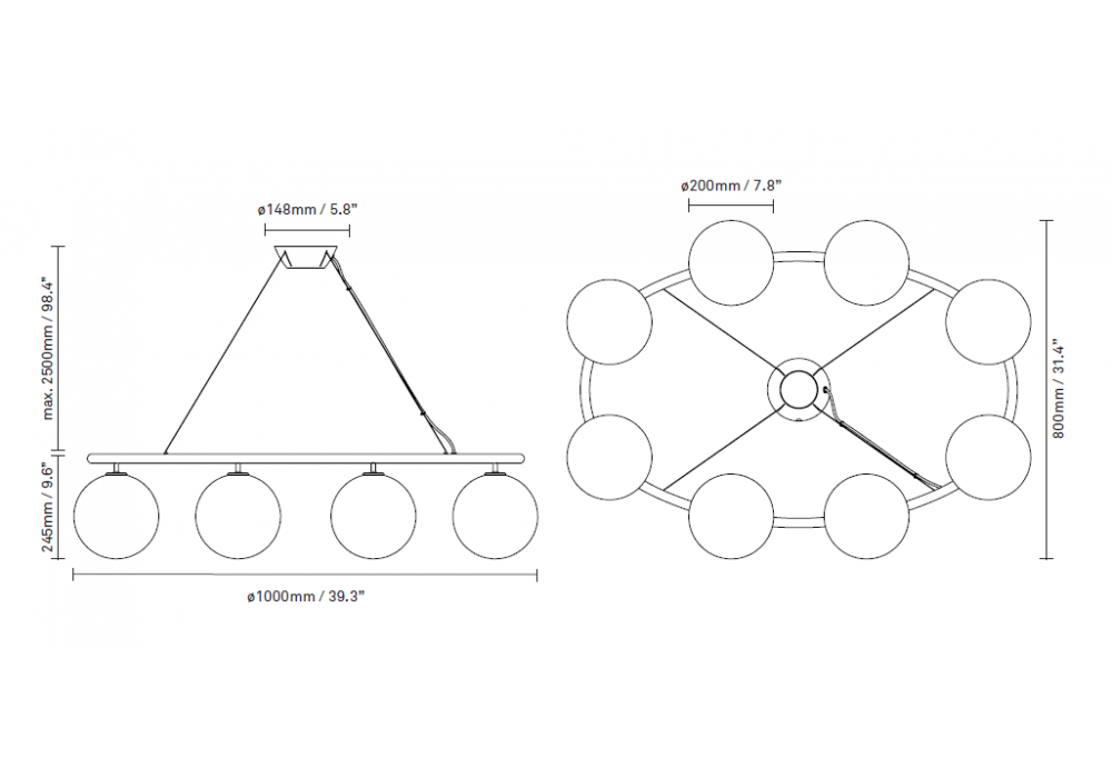 Miira 8 Oval designed by Sofie Refer for Nuura is a chandelier characterized by an oval-shaped, powder-coated metal ring. Spherical diffusers in mouth-blown opaline or transparent glass with relief motifs.