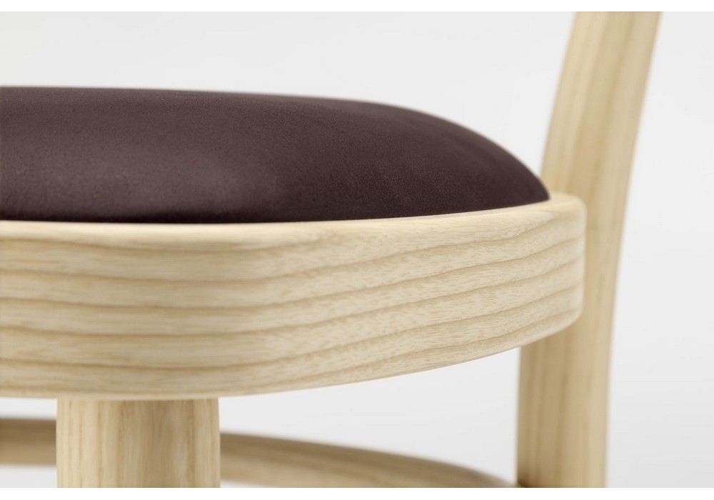 214 P designed by Michael Thonet for Thonet is a chair in curved wood and plastic feet. Upholstered seat with fabric, leather or hide upholstery. Structure in beech, available in different finishes.