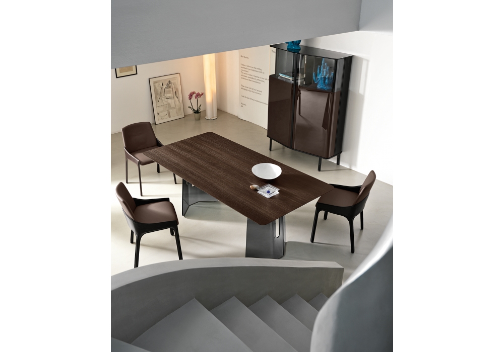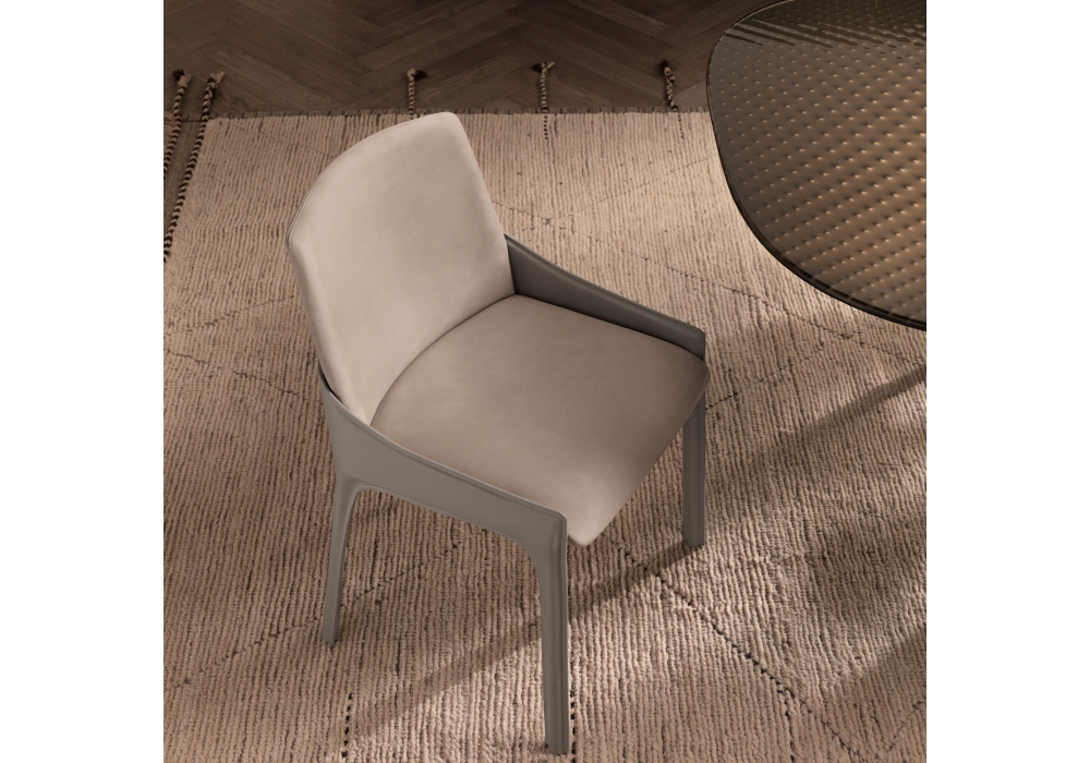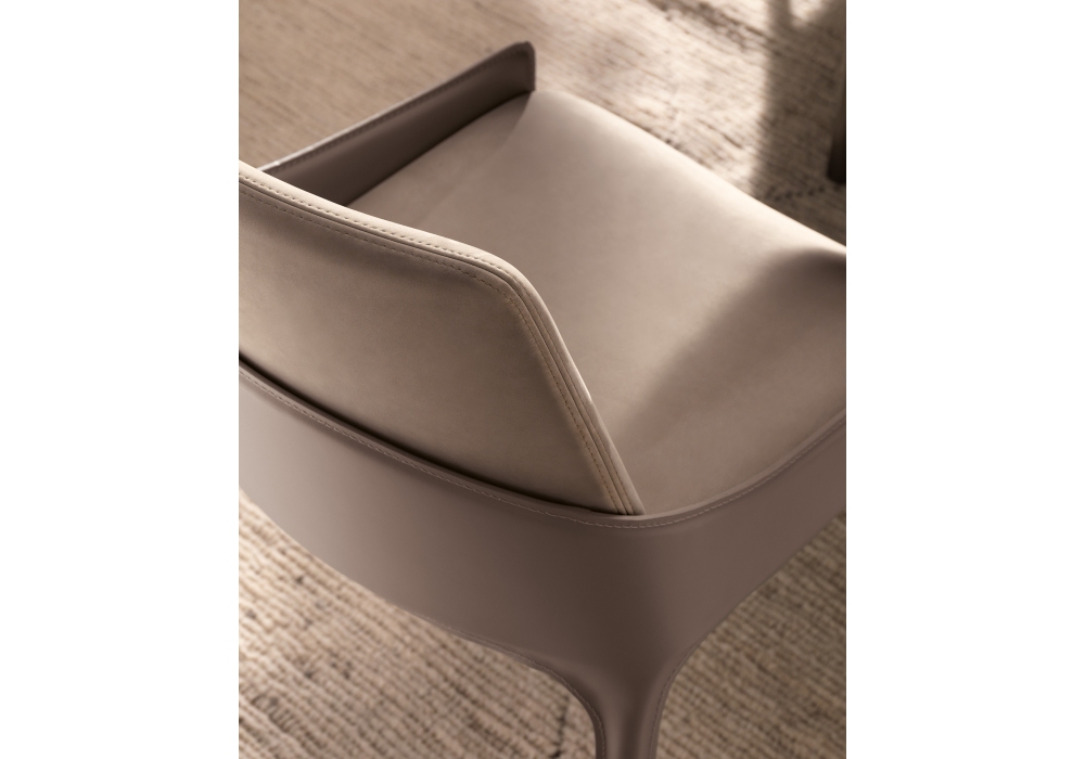 Pliè designed by Studio Klass for Fiam is a chair with structure covered in leather, seat and backrest with covering available in leather or nubuck. Internal structure in metal tubing and wood.