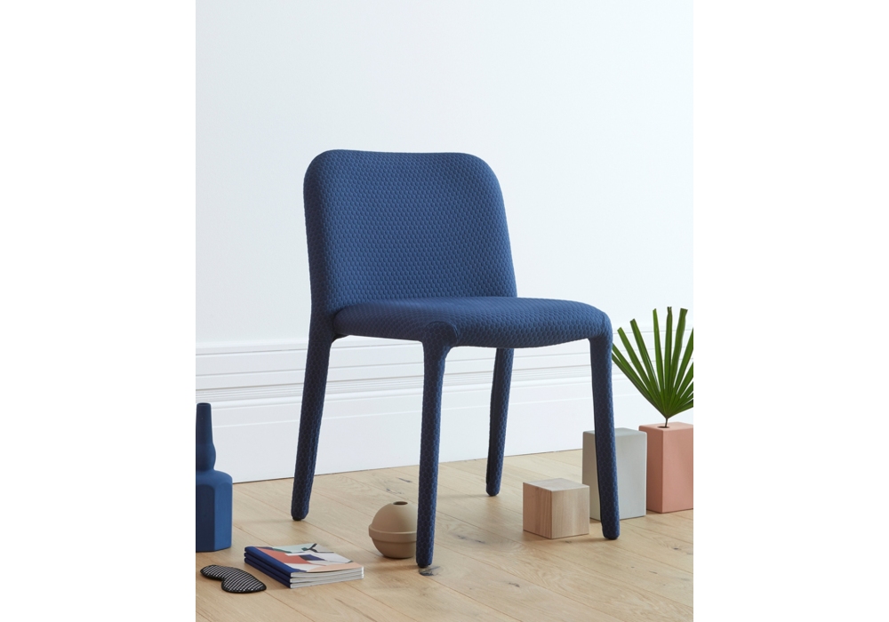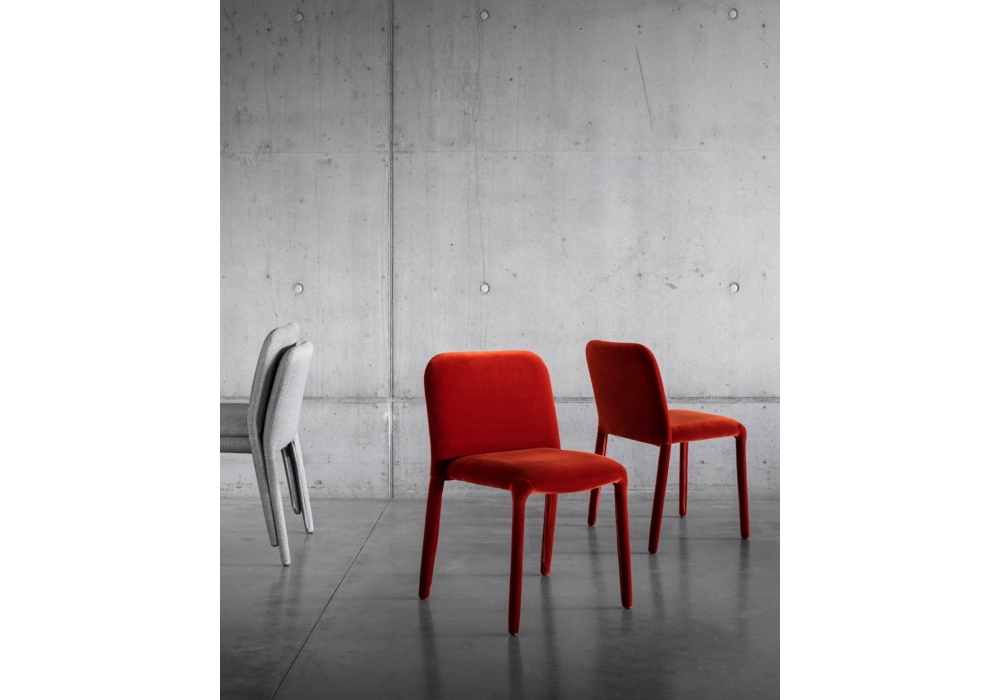 Pelè designed by E-ggs for Miniforms is a stackable chair with metal structure completely covered in fabric or eco-leather.