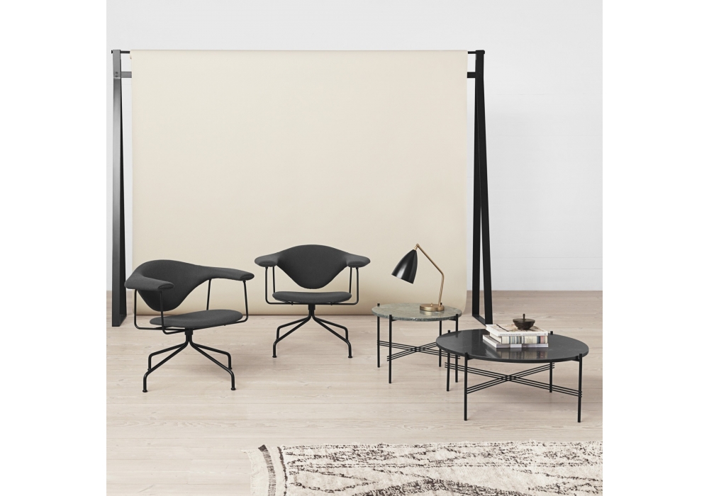 Masculo Lounge designed by GamFratesi for Gubi is a chair with swivel base made with semi-matt black steel structure and fabric or leather upholstery.