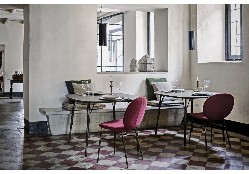 Kelly C designed by Claesson Koivisto Rune for Tacchini is an chair with high backrest and power-coated painted metal base. Kelly is a family of chairs with a friendly, playful character, reflected in its natural shapes, pure, bright colours and positive vibrations. The personality of each model is seen in the different shapes and proportions of the backrest and seat, always perched on slender metal leg structures, evocative of vintage furniture and works of modern art. Kelly chairs look great on their own or in any number of combinations and compositions, in the home or in contract spaces.