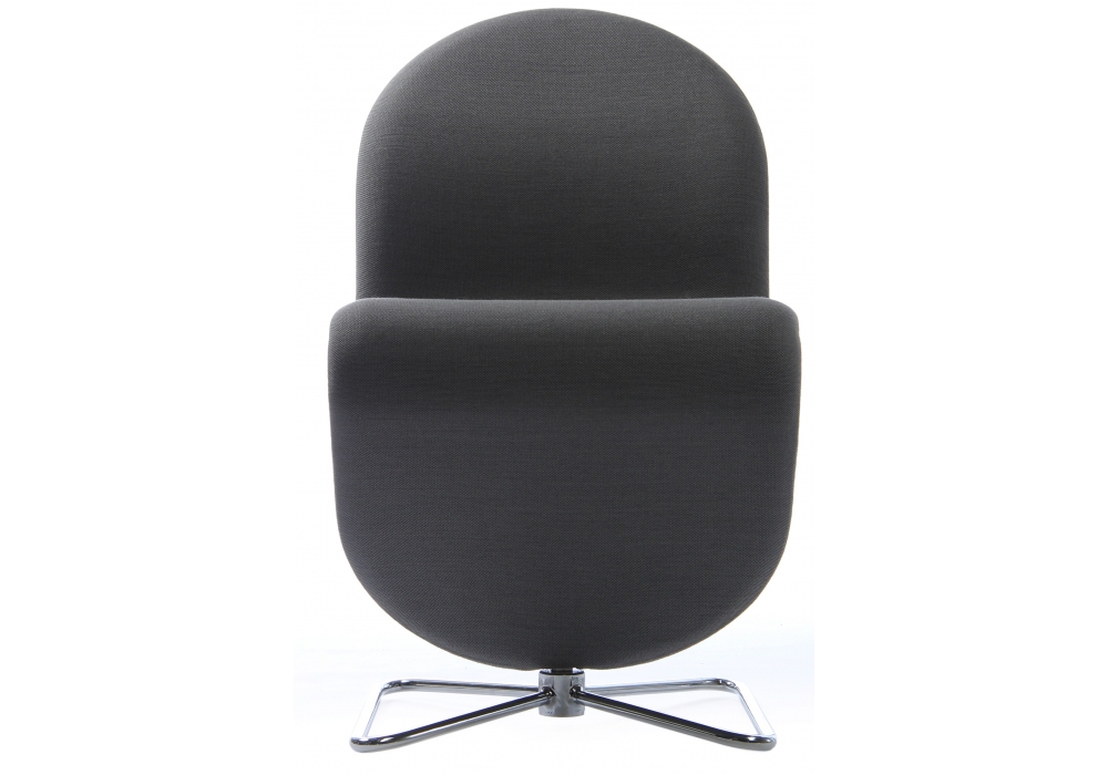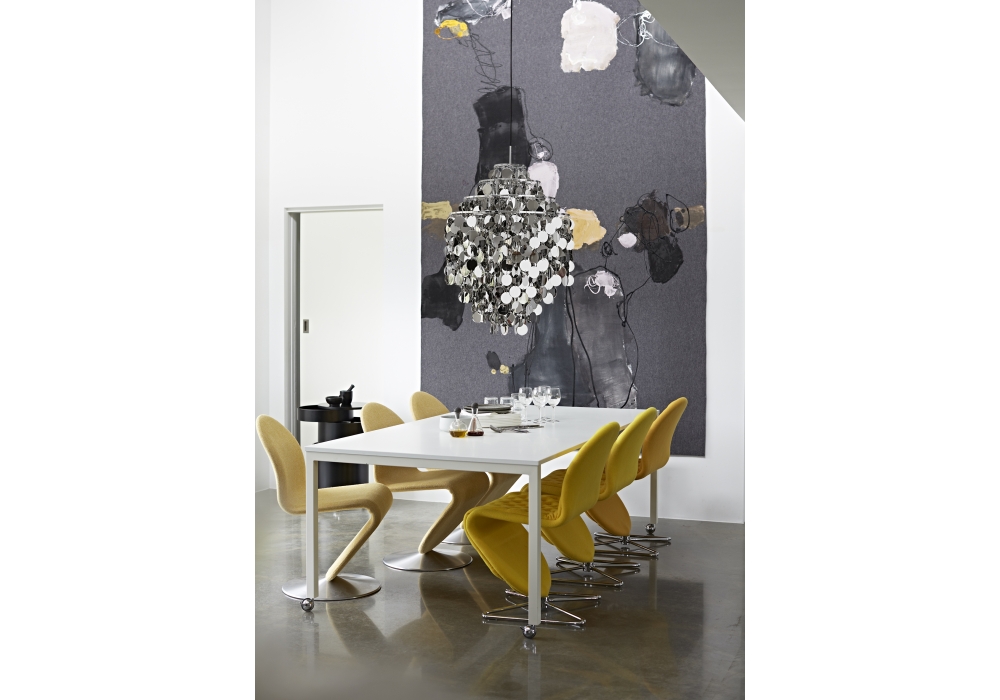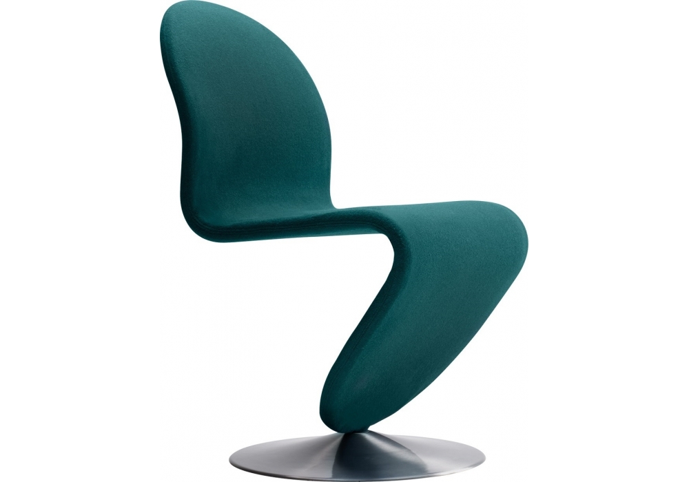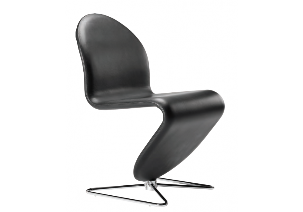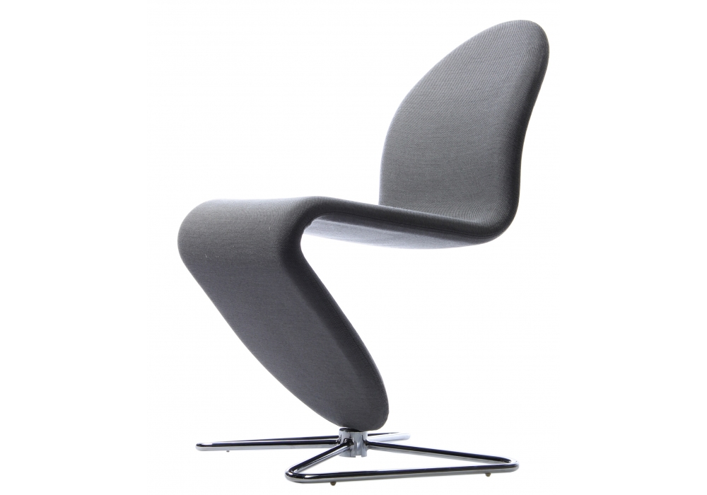 System 1-2-3 Dining Chair designed by Verner Panton for Verpan is an S-shaped dining chair with steel structure upholstered in leather or fabric in different finishes. The swivel base is available in the round version made of brushed aluminum, or in the shape of a butterfly in chromed steel.