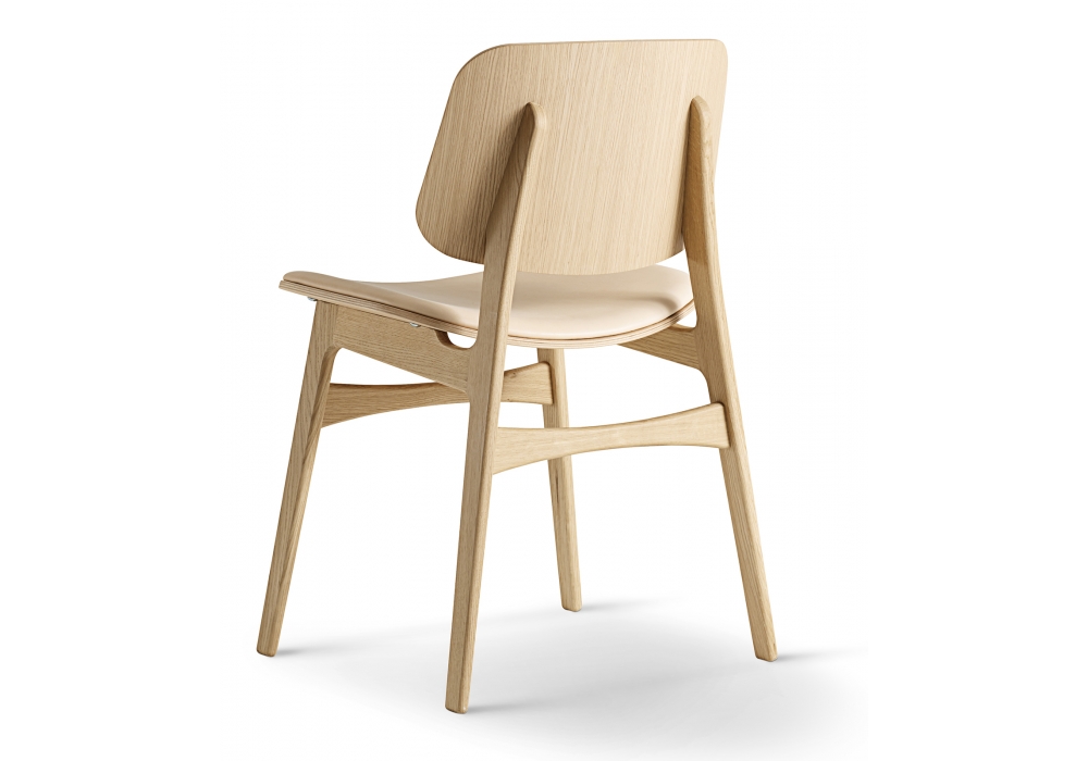 Søborg designed by Børge Mogensen for Fredericia is a padded chair with structure in solid oak or walnut. Interchangeable seat cushion padded with foam with fixed cover in fabric or leather.