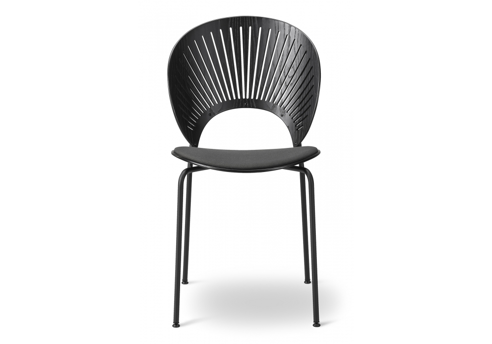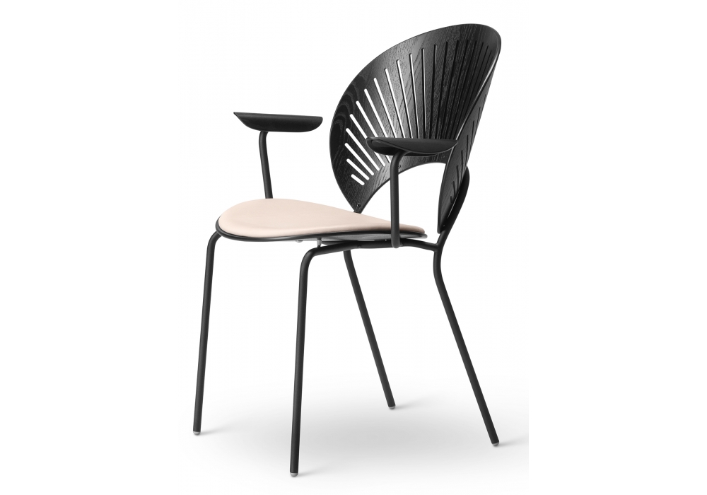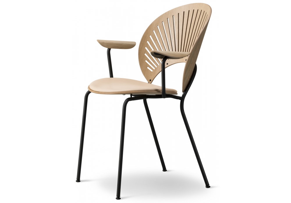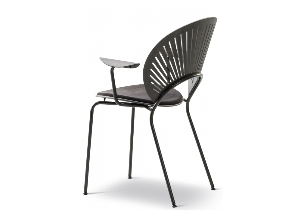 Trinidad designed by Nanna Ditzel for Fredericia is a chair upholstered with a steel tube structure and a plywood seat molded with CNC-milled cutouts. Seat and back mounted with rivets. Non-removable seat cushion padded with foam covered in fabric or leather. Available with or without armrests.