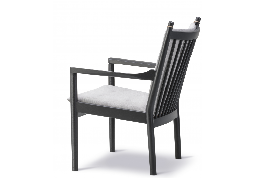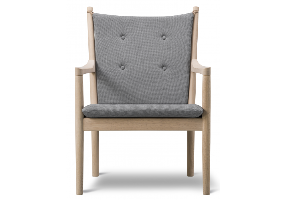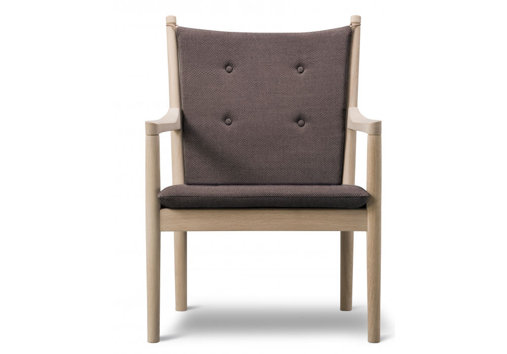Wegner 1788 designed by Hans J. Wegner for Fredericia is a chair with solid oak wood structure. Seat supported by jute straps. Interchangeable seat and back cushions in solid CMHR or HR foam, covered in fabric or leather and finished with buttons. Back cushion secured with leather straps. Available in fabric or leather.