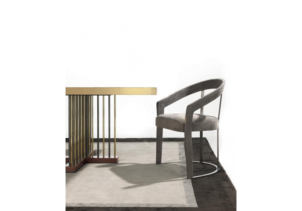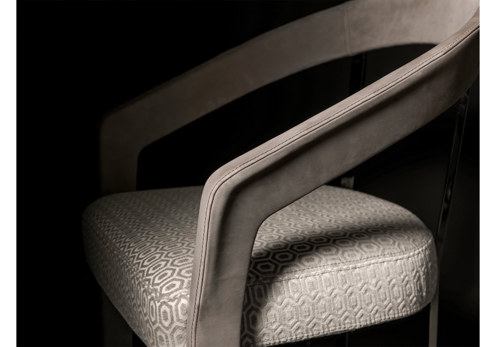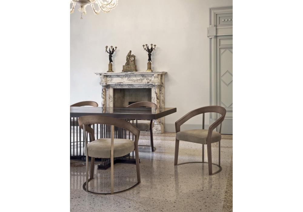 Frances designed by Giuseppe ViganĂ² for Longhi is a chair with structure available in wood or upholstered in leather. Seat cushion upholstered in different fabrics or leathers. Base and backrest supports available in multiple finishes. Optional backrest cushion.