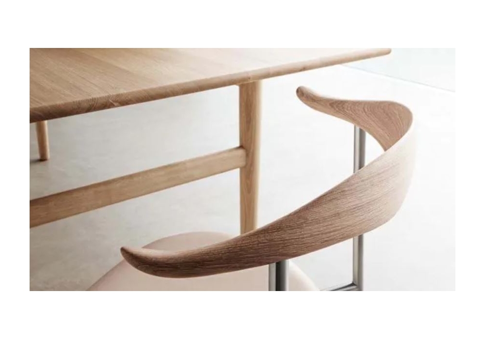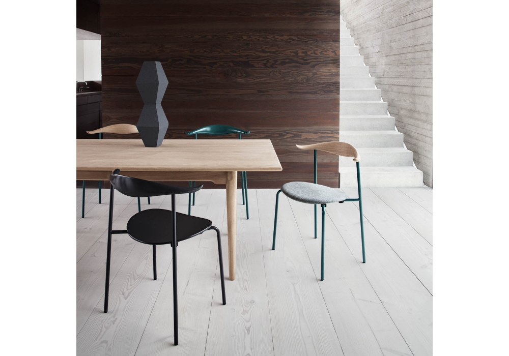 CH88P designed by Hans J. Wegner for Carl Hansen & Søn is a chair without armrests made with a stainless steel or black powder coated structure. Backrest in beech or oak in different finishes. Padded seat with fabric or leather upholstery.
