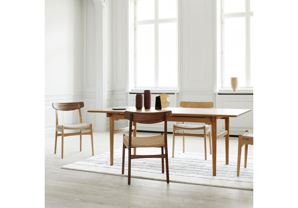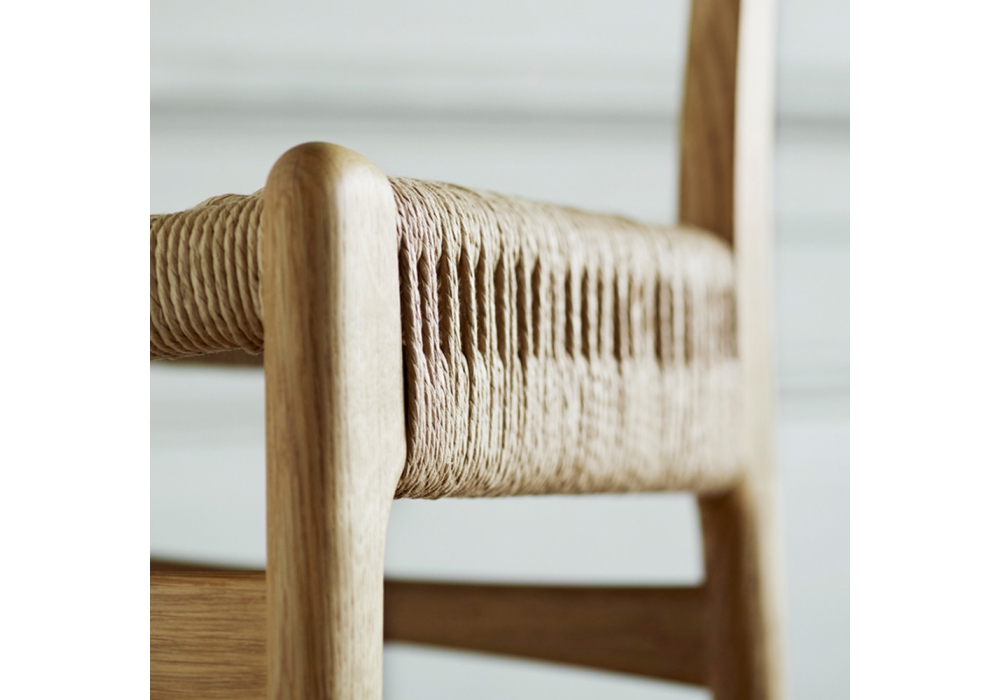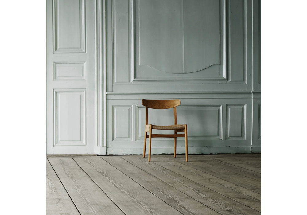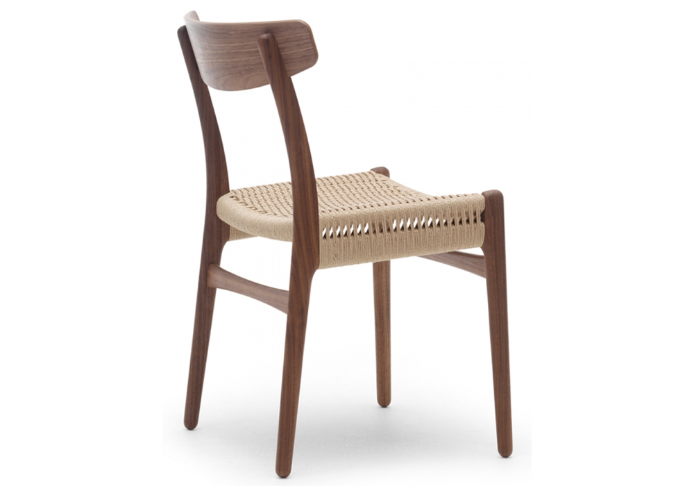 CH23 designed by Hans J. Wegner for Carl Hansen & Søn is a chair with structure and back in oak or walnut in different finishes and seat in natural or black paper cord. Oak / Walnut is a combined version, with seat structure in oak and backrest in walnut. The backrest is decorated with inlays in the same finish as the structure. In the oak/walnut version the inlay is oak-coloured.