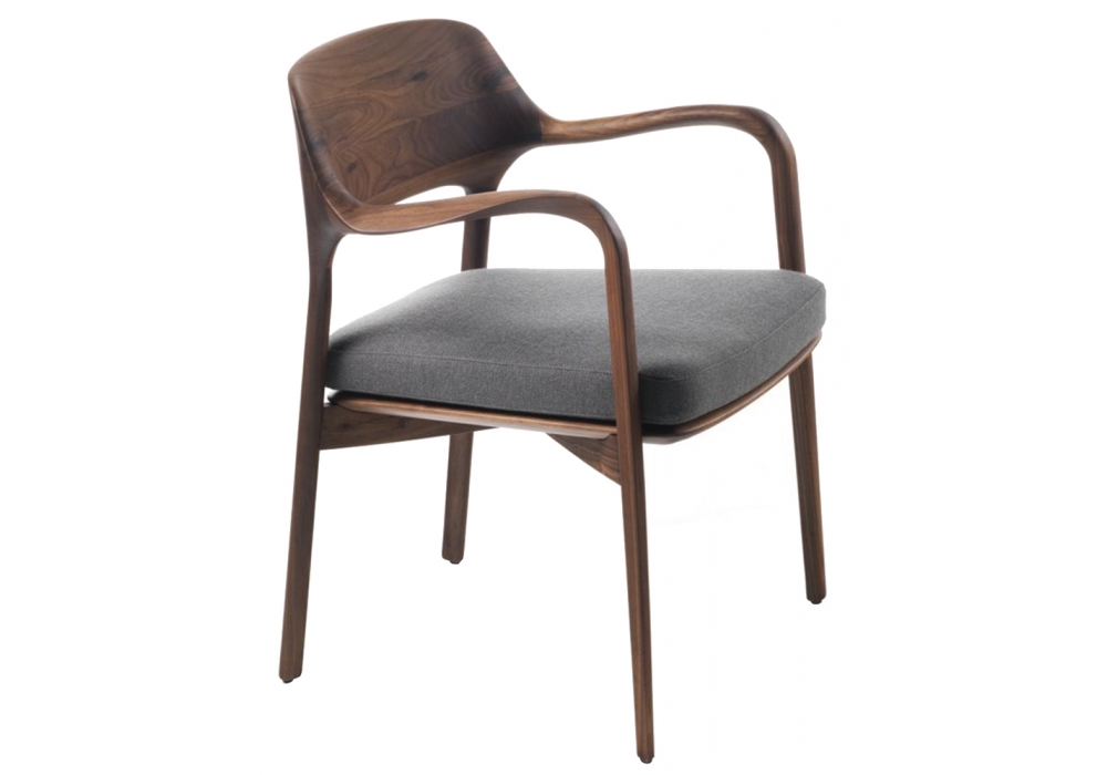 Ella designed by P. Jouin for Porada is a chair with armrests with frame in solid canaletta walnut available in three different finishes. Seat with different density foam padding with internal support in plywood. Upholstery in leather or fabric. Nylon end-feet.