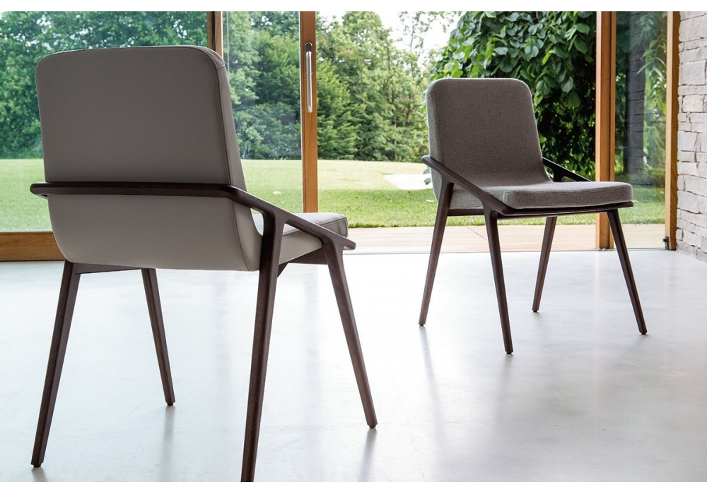 Lolita designed by Emmanuel Gallina for Porada is a chair with structure in solid canaletta walnut or ash wood available in different finishes. Upholstery in different types of leather and fabric. Available in two versions: with or without armrests.