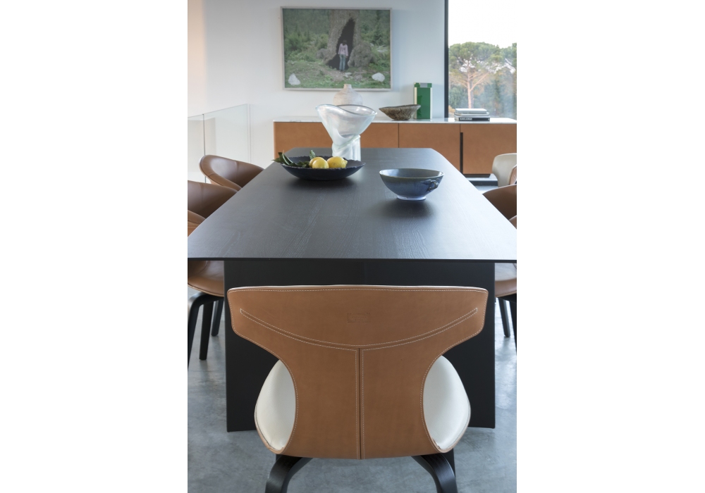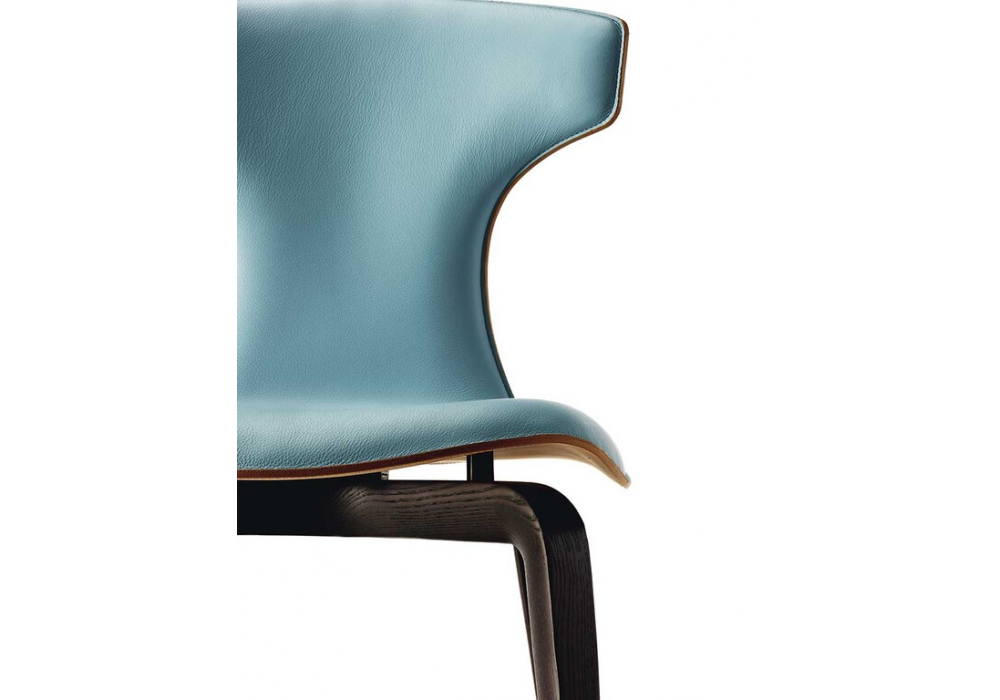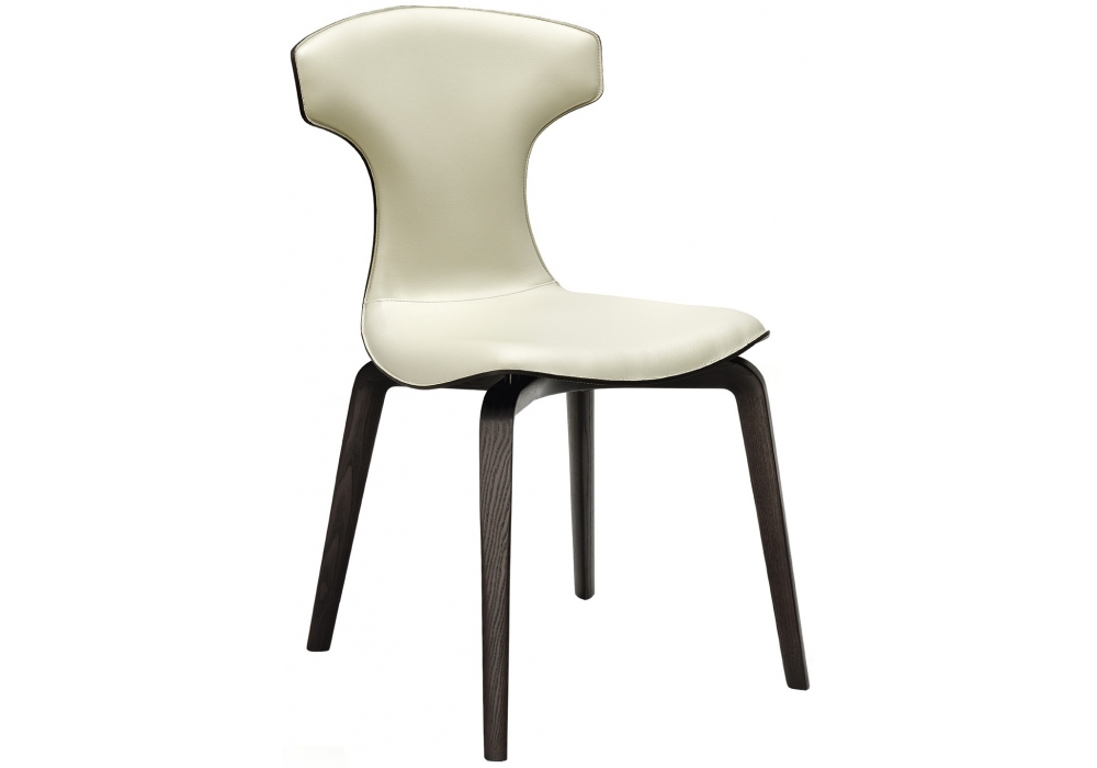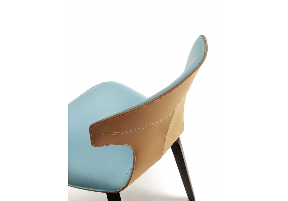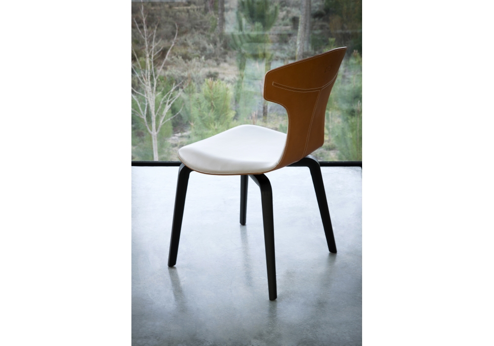 Montera designed by Roberto Lazzeroni for Poltrona Frau is dining chair with shell in moulded rigid polyurethane, padding in polyurethane foam and upholstery in Pelle FrauĀ® leather. Available in two versions: saddle-leather shell with inside upholstery leather or fully leather, single or two-tone. Leather and saddle-leather with clean-cut edges are sewn together with contrasting thread. The full leather version features tone-ontone stitching. Legs in solid ash wood or steel.