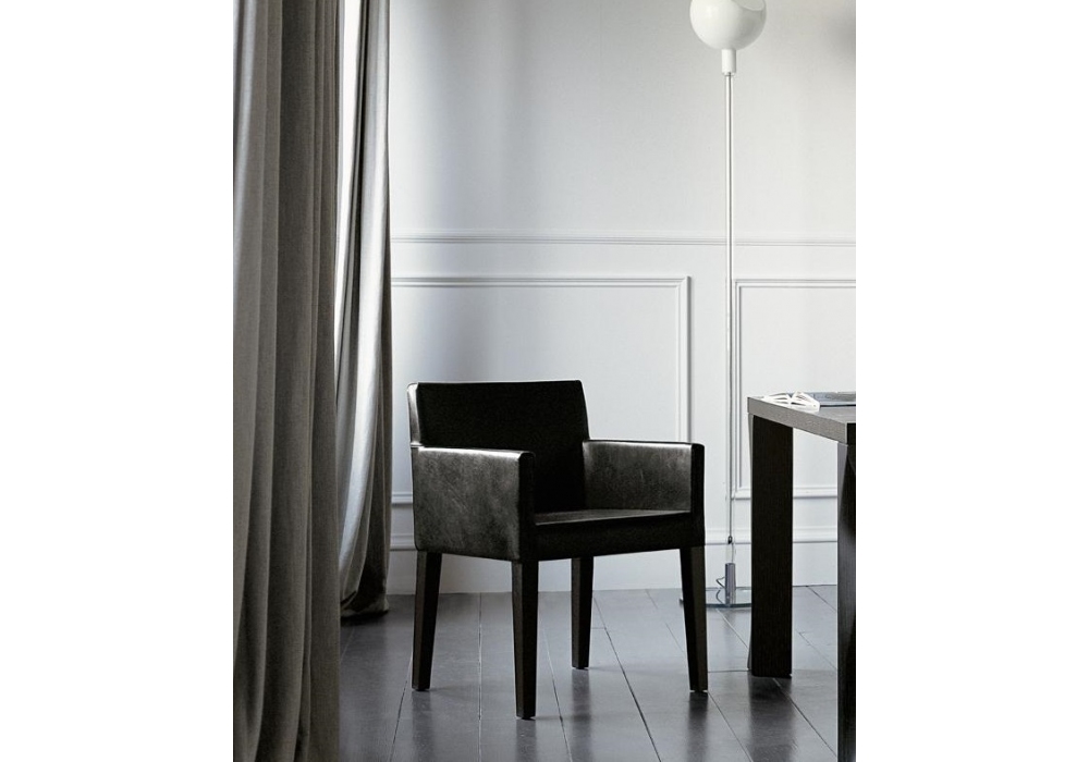 Quadra designed by Marco Boga for Casamilano is a chair with structure in flexible polyurethane. Self-extinguishing. Flexible backrest. Steel profile insert. Legs in ebony-stained solid oak. Removable cover (fabric) / fixed (leather). Also available in the version with piping.