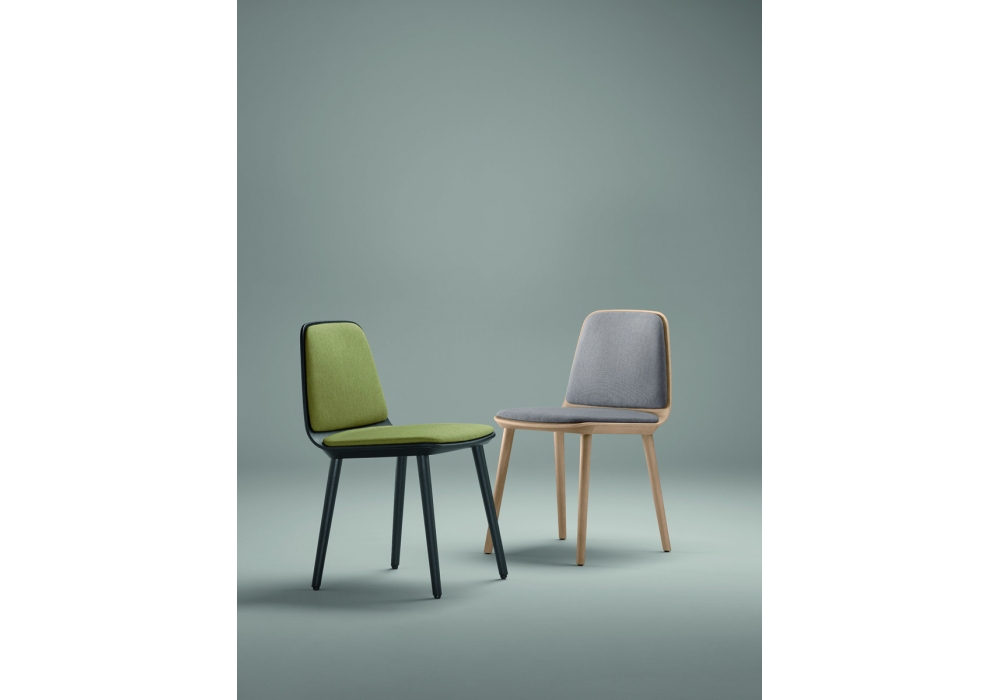 Bisell designed by Estudi Manel Molina for Treku is a chair upholstered frontally with a base made of wooden legs in different finishes and shell available with fabric upholstery in different shades.
