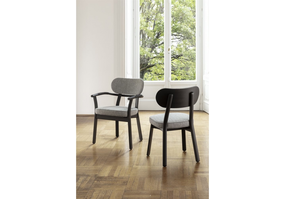 Evelin designed by Carlo Ballabio for Porada is a chair with armrests. Ash or open pore lacquered structure, fabric covering and armrests covered with leather cord.