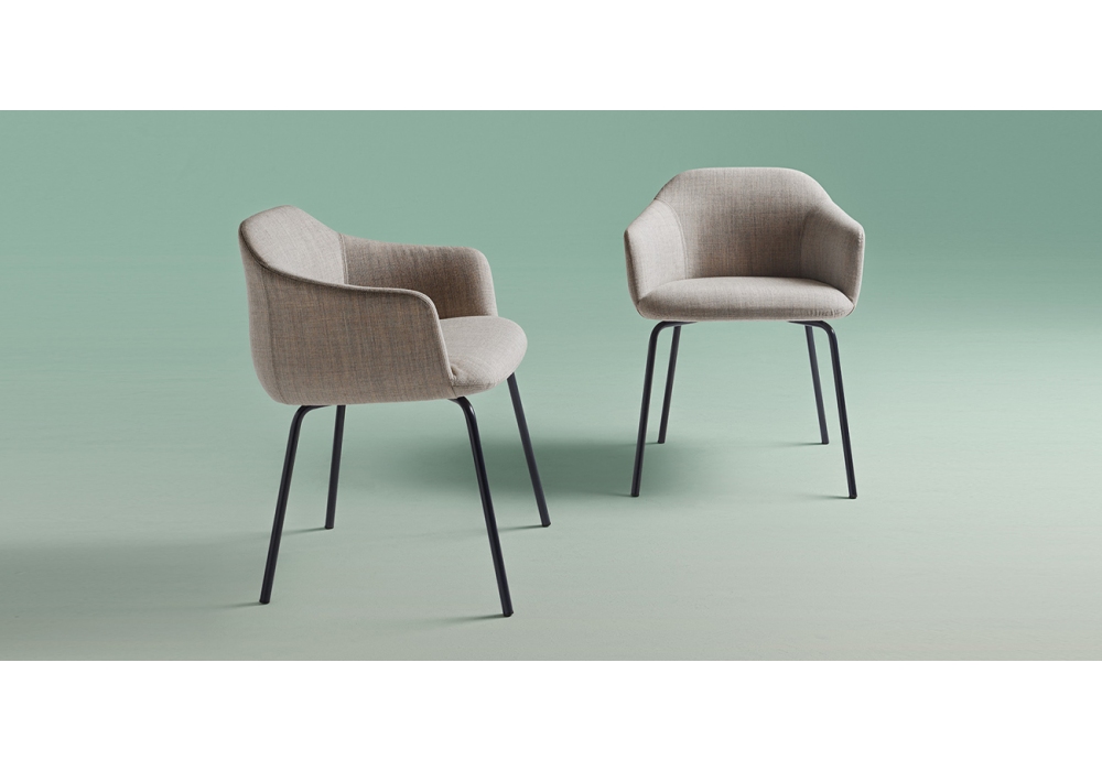 Cloe designed by Federica Blasa for My Home Collection is a chair with painted steel legs and shell in polimex covered in polyurethane rubber. The lining is in fabric. Cloe is available in different fabric and metal finishes.