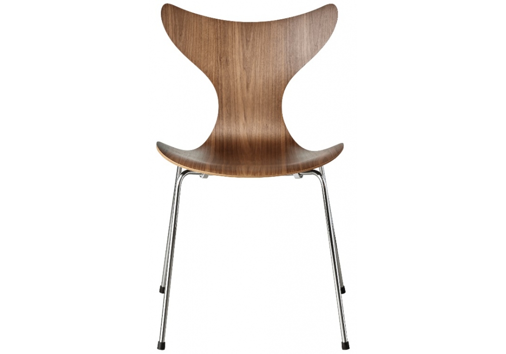 Lily designed by Arne Jacobsen for Fritz Hansen is a chair made with backrest and seat in natural walnut-colored wood veneer and chromed base.
