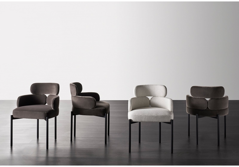 Sylvie designed by Andrea Parisio for Meridiani is a chair tube frame in matt black varnished metal and padding in polyurethane foam with different densities and polyester fiber. Back frame in three pieces of moulded multi-layer wood. Seat frame in multi-layer wood.