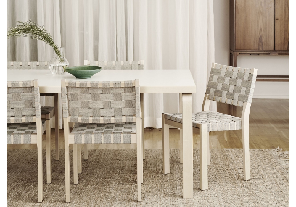 Chair 611 designed by Alvar Aalto for Artek is a chair made with solid birch structure, seat and backrest in linen webbing. Available in different finishes.