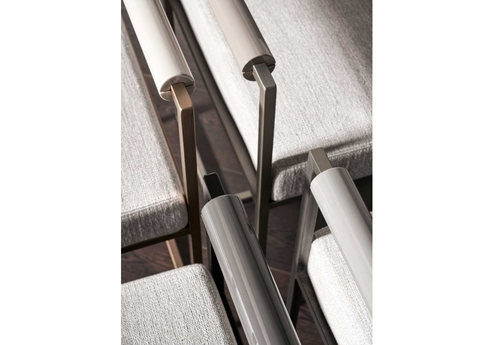 Rider Wood designed by Andrea Parisio for Meridiani is a chair with armrests in solid oak or beechwood when laquered. Frame in moulded polyurethane foam with metal insert.  Base in metal in the following finishes: metal, bronzed brass and platinum steel varnished. Black glides.