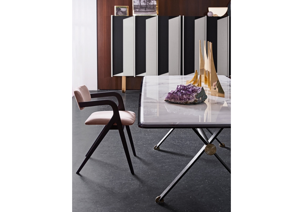 Keyko designed by Pinuccio Borgonovo four Gallotti&Radice is a chair with black lacquered open pore solid curved ash structure. Also available in natural ash, tobacco stained or white open pore lacquered ash. Curved plywood seat with polyurethane foam padding and backrest made of structural polyurethane dipped in flexible polyurethane foam covered by fabric or leather as per samples.