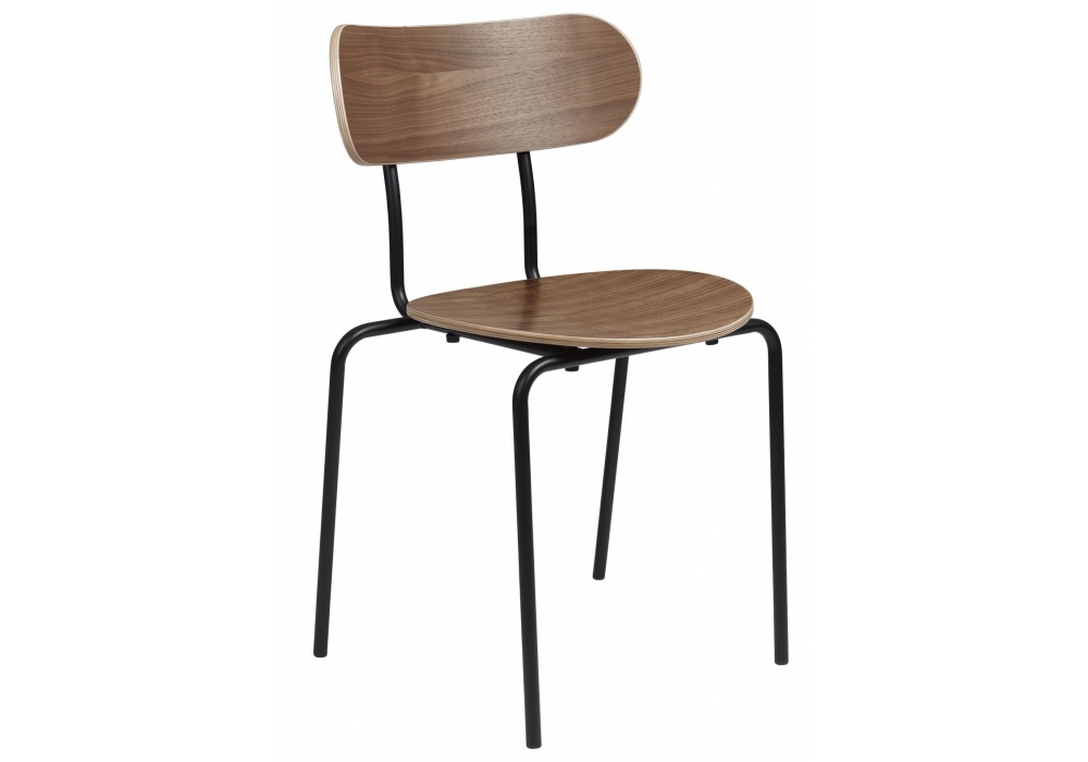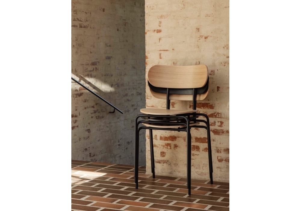 Coco designed by Oeo Studio for Gubi is a stackable chair composed of black metal structure and wood seat and back.