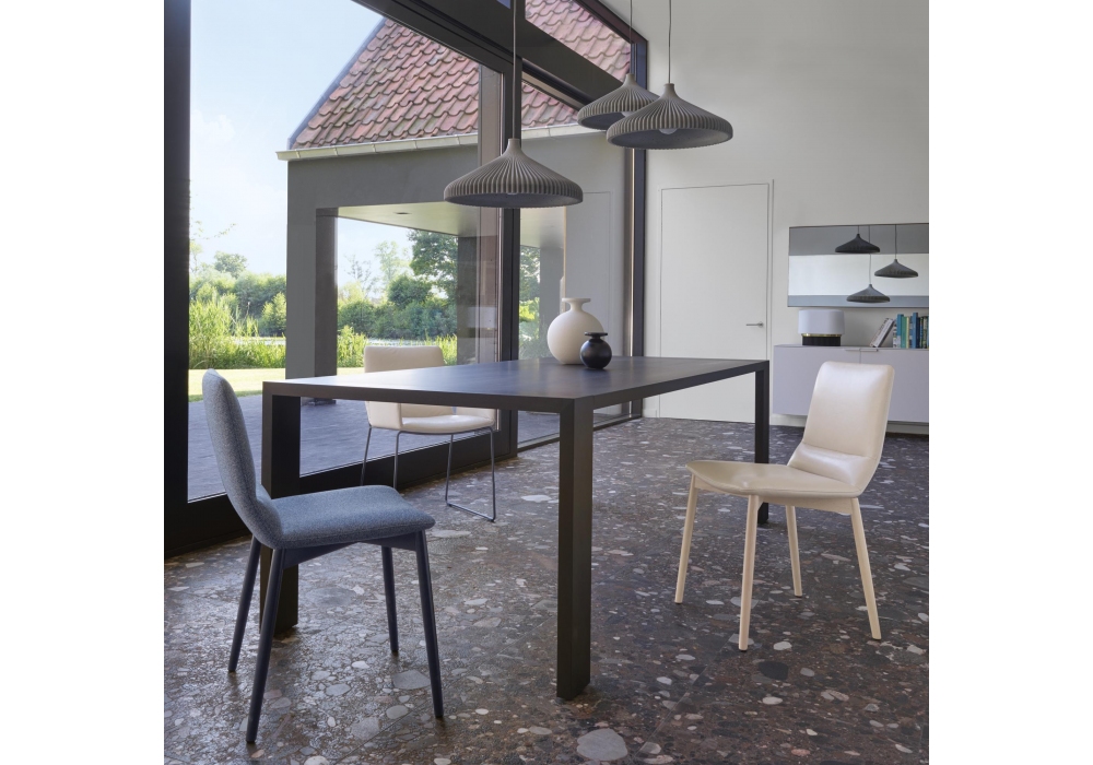 Bendchair designed by Peter Maly for Ligne Roset is a chair with shell in moulded beech multi-ply. Padding in high resilience foam and polyester. Base in stained beech (turned legs), or sleigh base in metal wire, Ø 11mm. Upholstery available in fabric or leather.