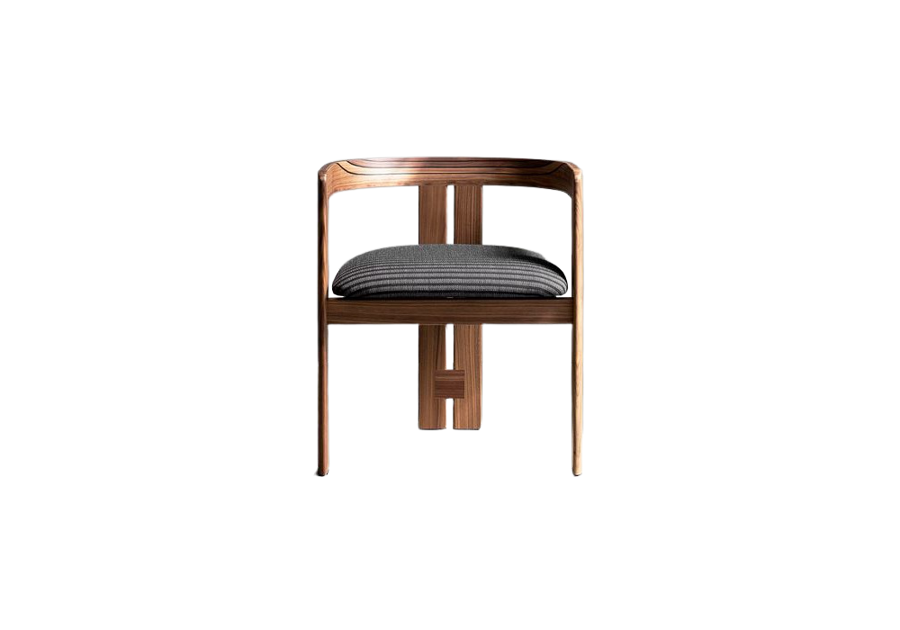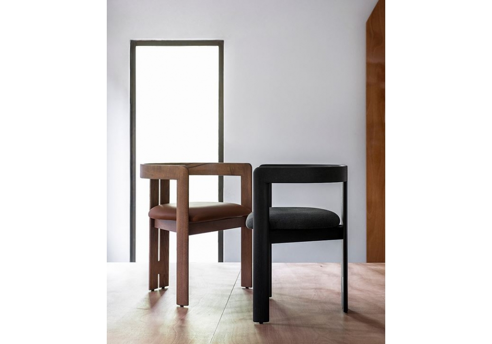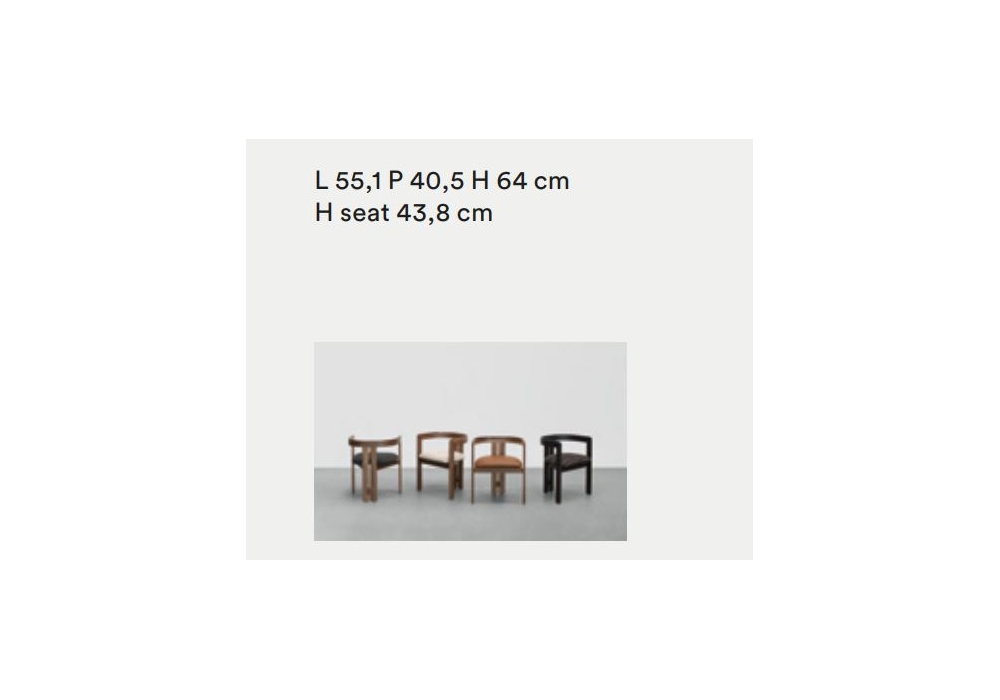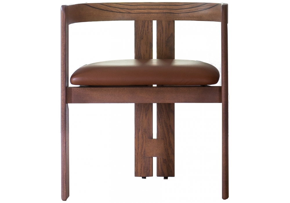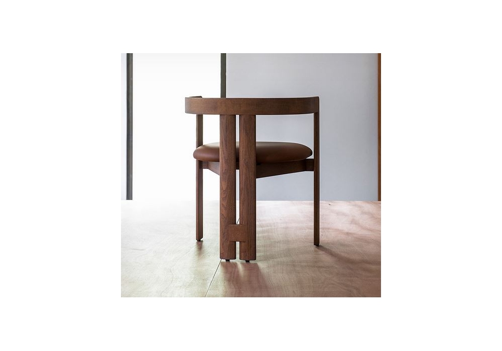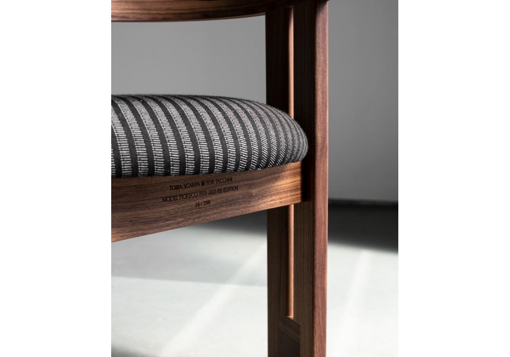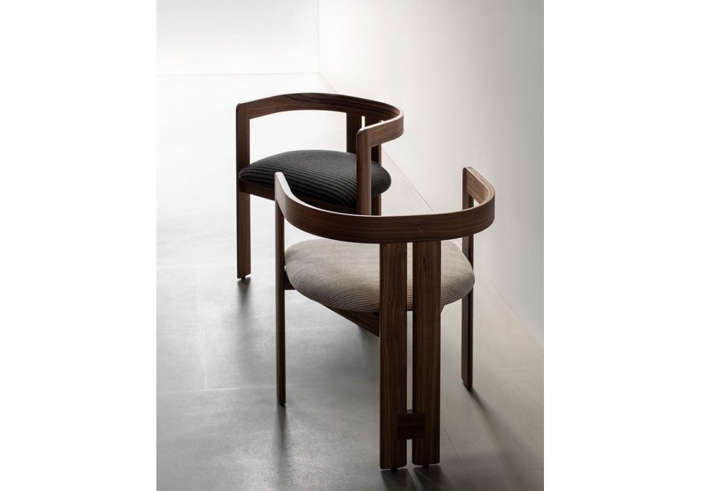 Pigreco designed by Tobia Scarpa is a chair made up of four legs, two of which are very close, in canaletto walnut or ash, in different finishes. The padded seat cushion is available in fabric or leather.