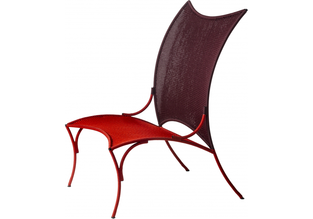 Arco designed by Martino Gamper for Moroso is a chair made of painted steel base and colored polyethylene handwoven threads.