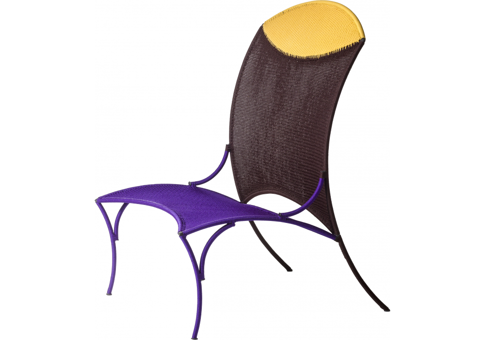 Arco designed by Martino Gamper for Moroso is a chair made of painted steel base and colored polyethylene handwoven threads.