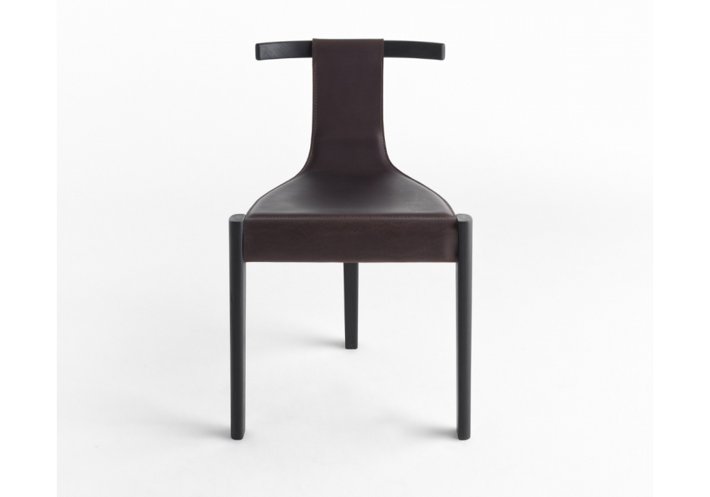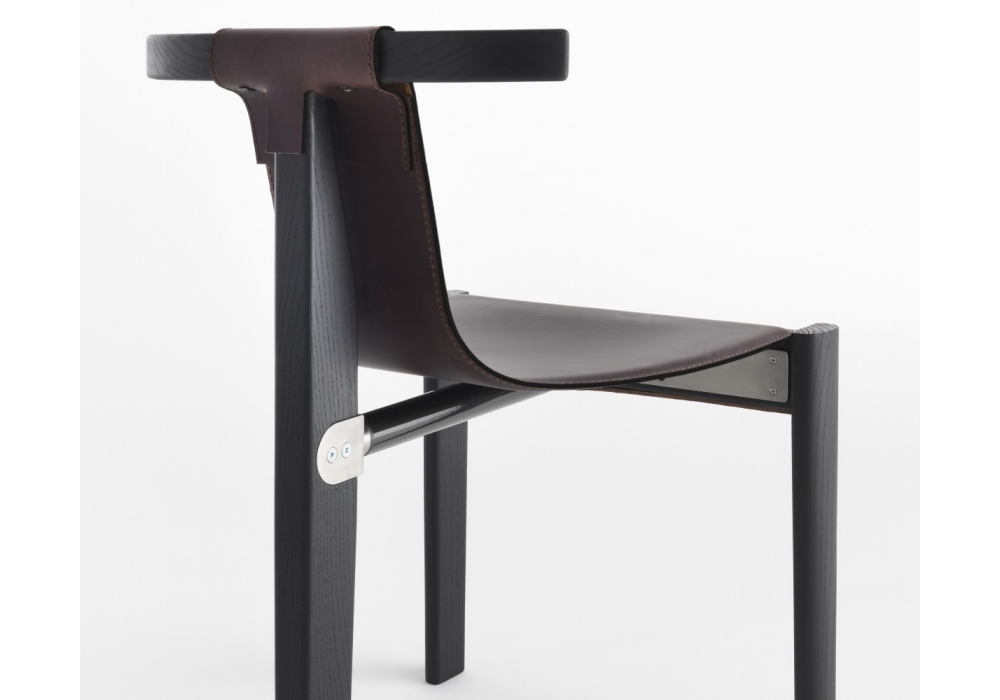Pablita designed by Marcello Pozzi for Casamania & Horm is a three-legged chair made with a supporting structure and back in solid black ash. Connecting element between the legs in stainless steel and carbon fiber. The suspended seat is made with a metal core completely upholstered with hard leather.