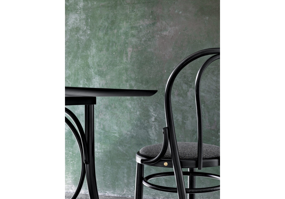 N. 18 designed by Gebrüder Thonet Vienna is a chair made of bent beech, available in different finishes. Padded seat with fabric or leather upholstery.