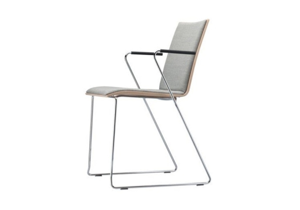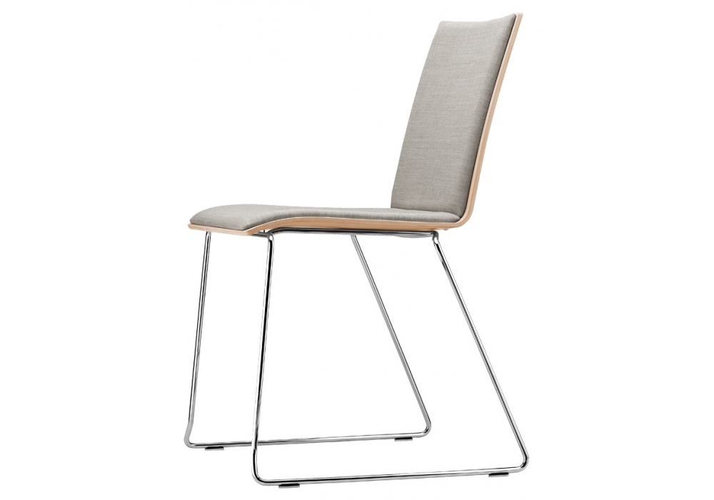 S 182 PST / PFST designed by Delphin Design for Thonet is a chair in chromed steel wire and plastic feet. Shell in shaped beech plywood in different finishes and two sizes. Upholstery in fabric, leather or cowhide. The chair is also available with or without armrests.