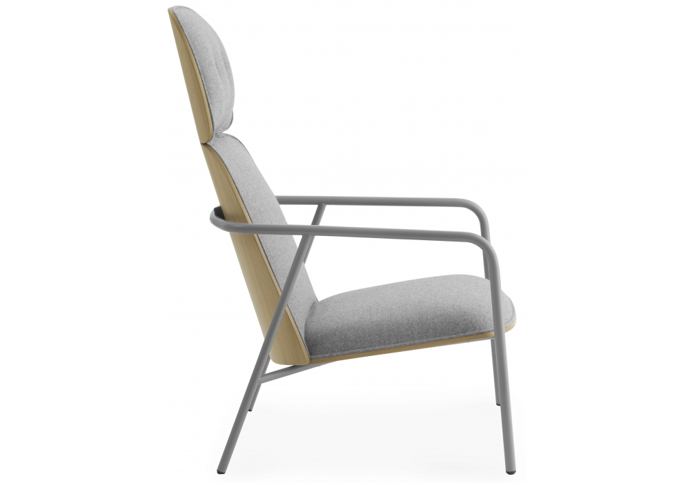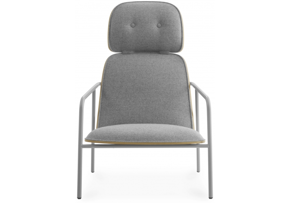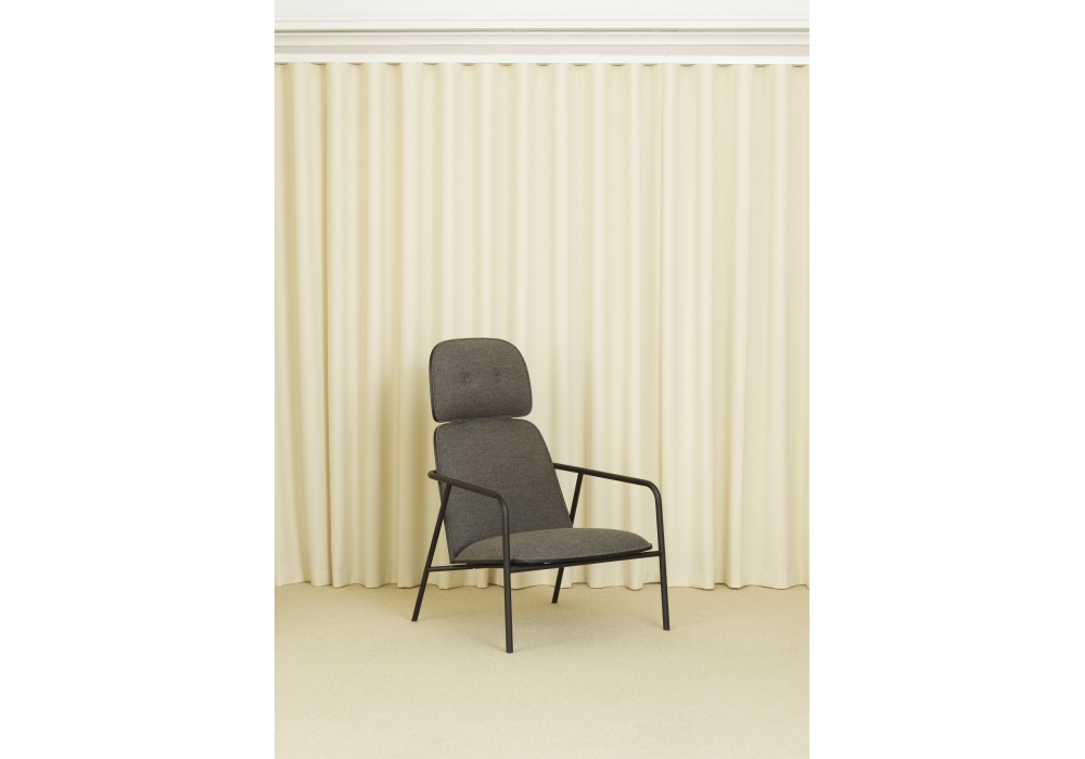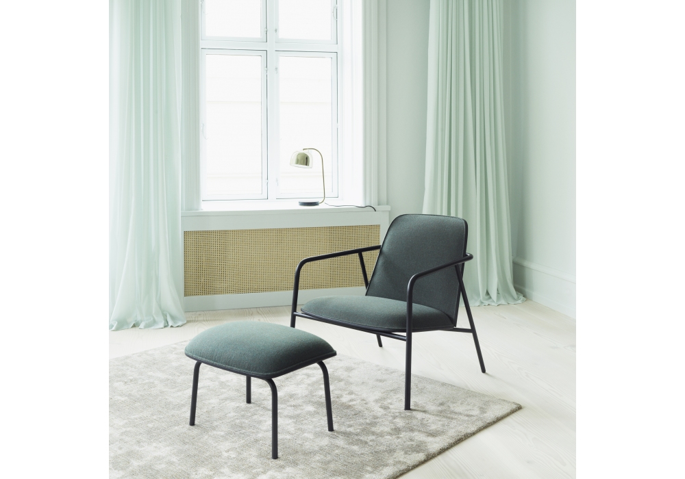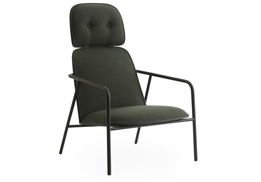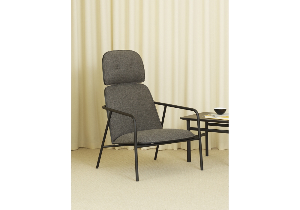 Pad, designed by Simon Legald for Normann Copenhagen is a seat, with tubular structure in black or gray powder coated steel. Seat, back and headboard are in wood, in black or natural wood finishes, padded with PU foam covered with fabric or leather in different colors.