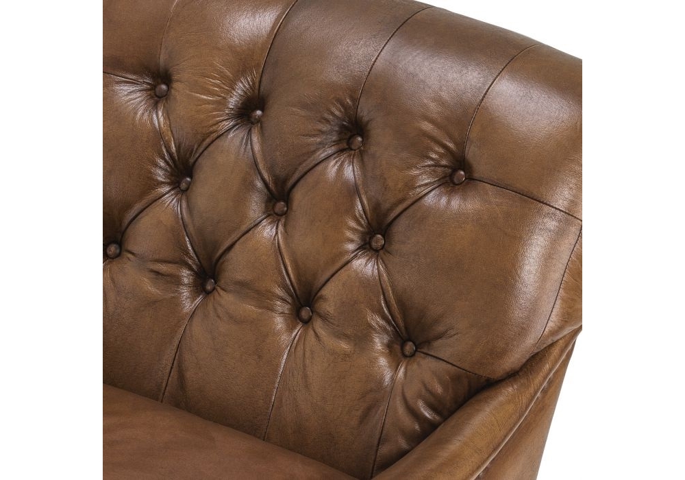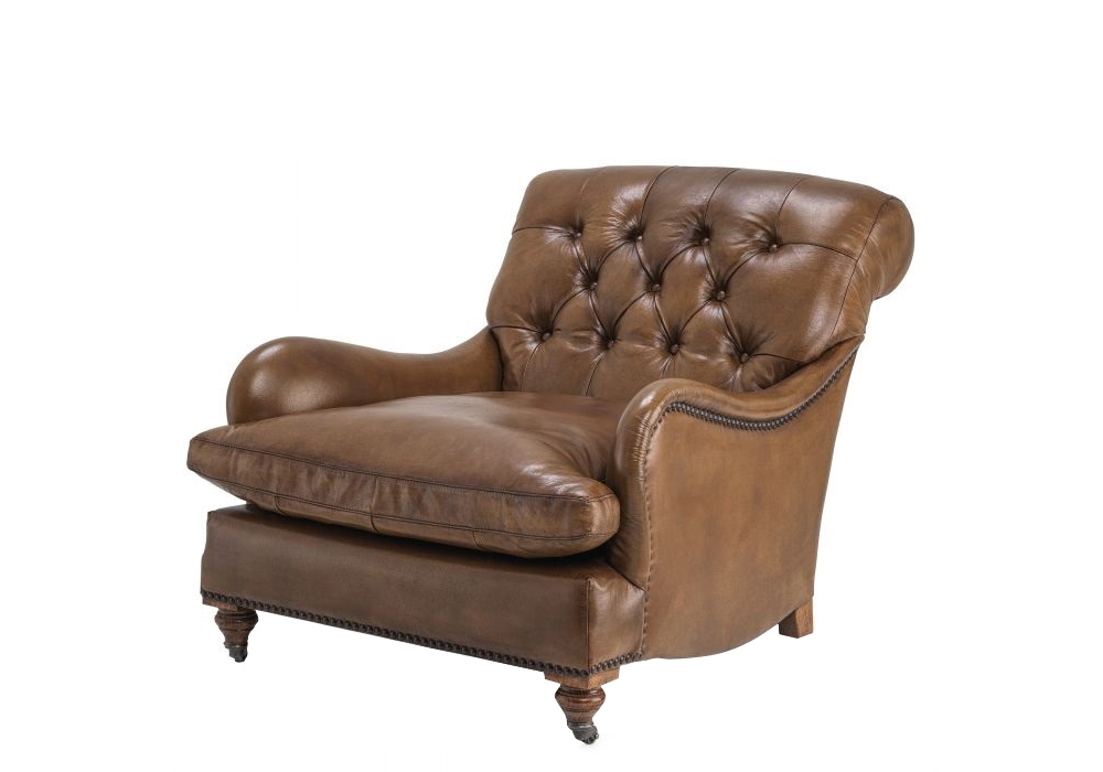 Club Chair Caledonian designed by Eichholtz is a chair with tobacco-colored leather upholstery featuring a back with buttons, elegant armrests and backrest, antique brass rivets and front legs in dark wood with wheels.