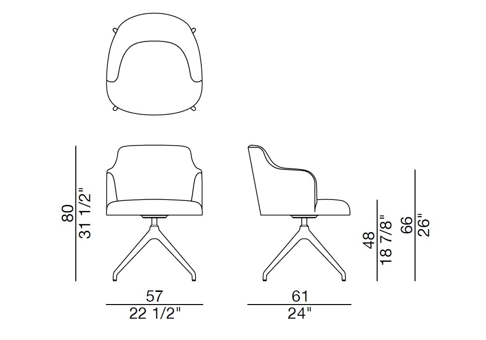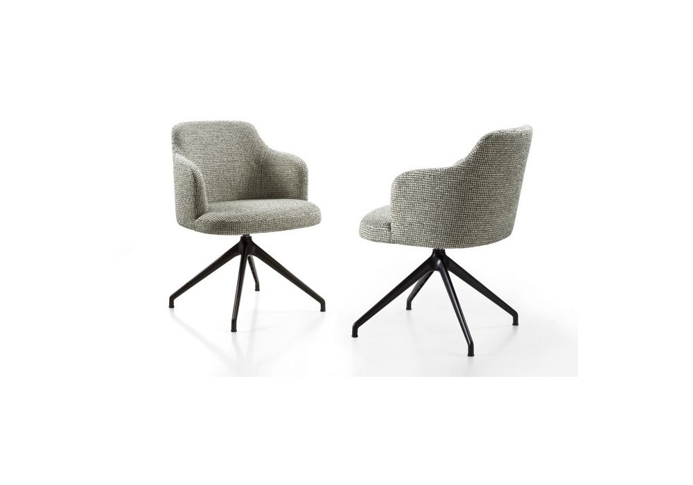 Abby designed by Gabriele & Oscar Buratti for Porada is a swivel chair with armrests made with a four-spoke metal base and fabric upholstery.