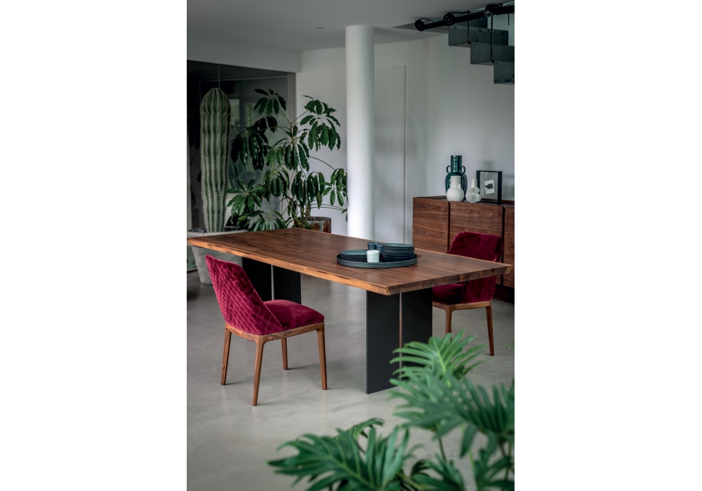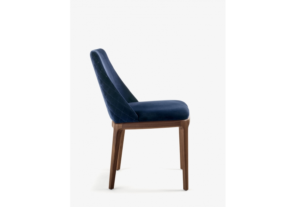 Cloe designed by C.R. & S. Riva 1920 is a chair with solid wood legs and polyurethane foam shell in continuity with seat and back. Upholstery in leather or fabric, backrest with diamond stitching or smooth.
