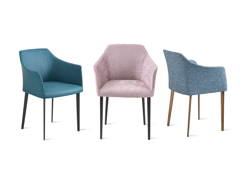 Carmen Comfort designed by Stefano Sandonà and Sabrina Bettini for Riflessi is a chair with armrests with padding in flexible cold-molded polyurethane and steel frame. The frame structure is integrated into the body. Legs painted in aluminum and upholstery in fabric or leather. Available in different finishes.