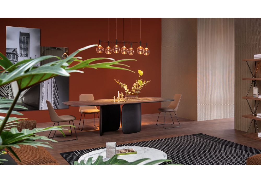 Itala designed by Gino Carollo for Bonaldo is a chair available in various models, with sled base or with 4 legs in painted metal in different finishes. The non-removable cover is in fabric or leather in various colors.