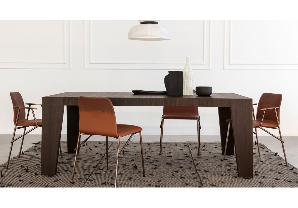 Alunna designed by Emilio Nanni for Pianca is a chair with or without armrests made with tubular metal structure, shell in curved beech plywood, padded with polyurethane foam and upholstered in fabric, synthetic leather or leather. On request it can be made in the two-tone version, differentiating the fabric of the upper part of the backrest from that of the rest of the seat.
