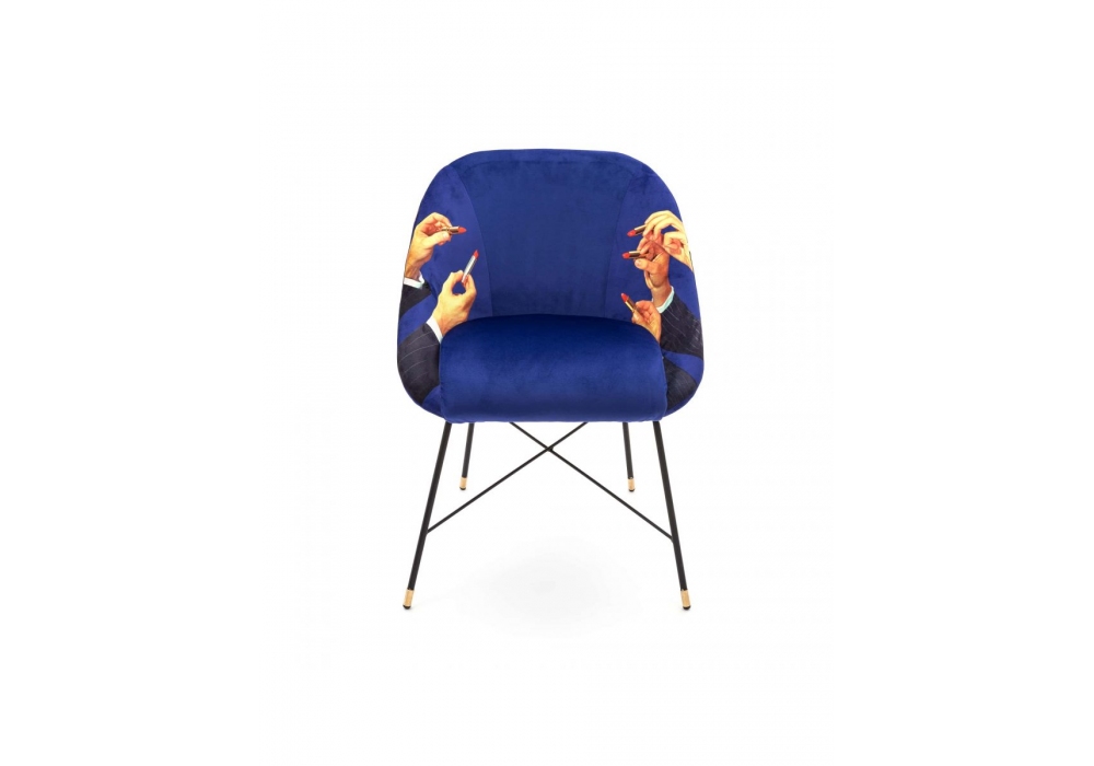 Lipsticks designed by Toiletpaper for Seletti is a chair with black tubular metal feet with brass details. The body is made of plywood with polyurethane padding and polyester covering