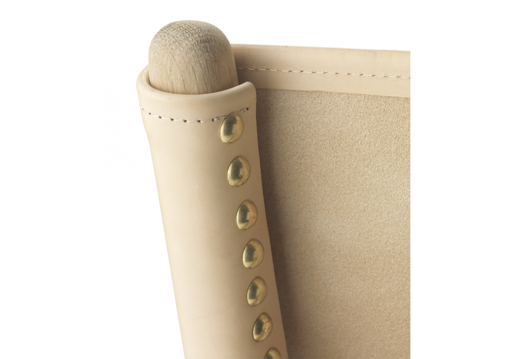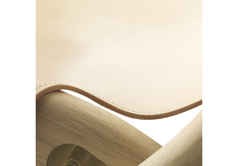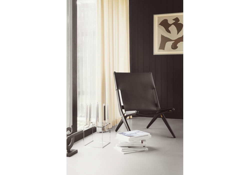 Saxe designed by Mogen Lassen for Audo Copenhagen is a folding chair made of leather, brass and oak wood. It is possible to purchase the Saxe Hang Up to hang the chair on the wall. Available in different finishes.
