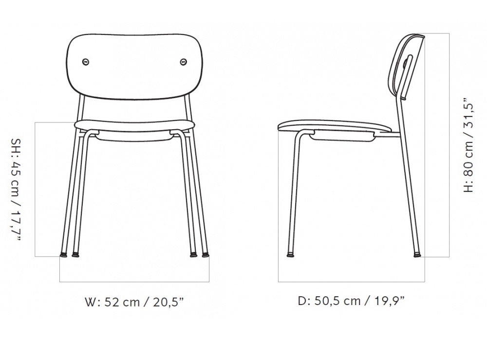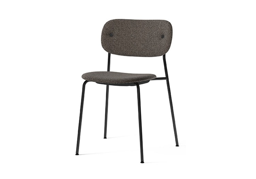 Co Fully designed by Norm Architects & Els Van Hoorebeeck for Audo Copenhagen is a chair with upholstered seat and back, covered in fabric or leather. Legs in black powder coated or chromed tubular steel.