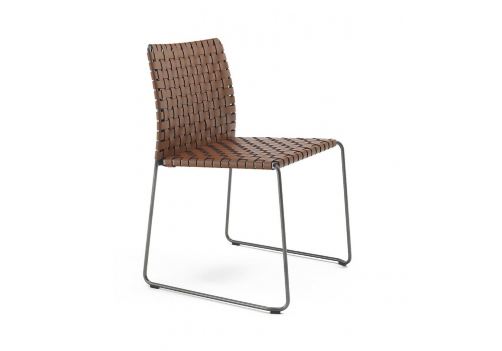 Bizzy Intrecciata designed by Franco Bizzozero for Enrico Pellizzoni is a chair with steel rod structure in different finishes, seat and back covered in woven leather. Underseat in sheet metal covered in black technical fabric. Available with or without armrests.